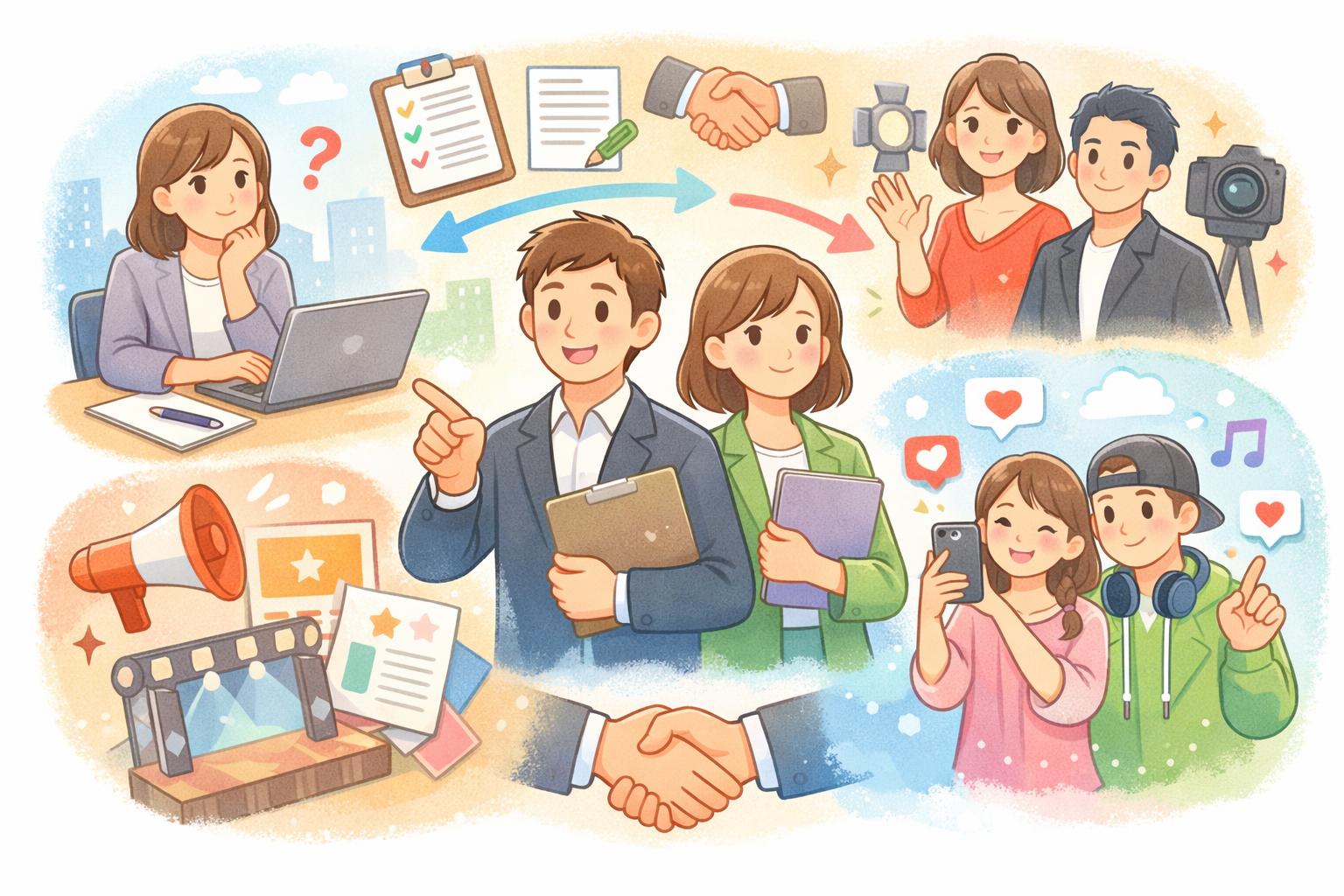タレントやインフルエンサーを自社の広告やイベントに起用したいと考えたとき、まず相談先として挙がるのが「キャスティング会社」です。しかし、芸能事務所や広告代理店と何が違うのか、具体的にどのような役割を担っているのか、正確に理解している方は少ないかもしれません。